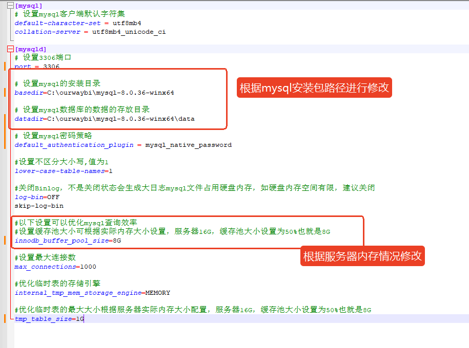 在mysql的文件夹中找到my.ini文件,根据实际情况配置文档中的缓存池及临时表最大内存,如该路径下没有配置文件,点下面下载my.ini 配置文件进行修改