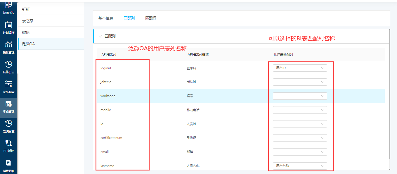 匹配列通过基本信息的窗口,将泛微OA用户表与奥威BI用户表进行关联。匹配列页面包含的基本信息:API结果列、API结果列描述、用户表匹配列。
