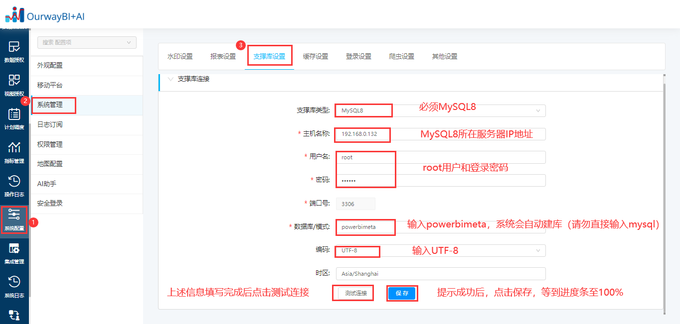 下载标准版前必须要把奥威BI软件的支撑库更换为mysql数据库类型,如未安装可点击此处跳转mysql安装,按照下方截图找到支撑库信息编辑处,填写上对应的连接信息测试连接并保存。