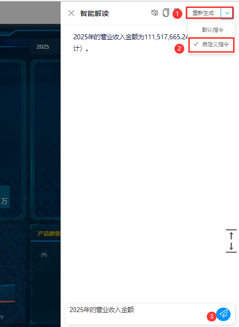 可以切换成自定义指令进行报表解读(默认为系统指令),AI会根据提问问题并结合报表内容进行解答。