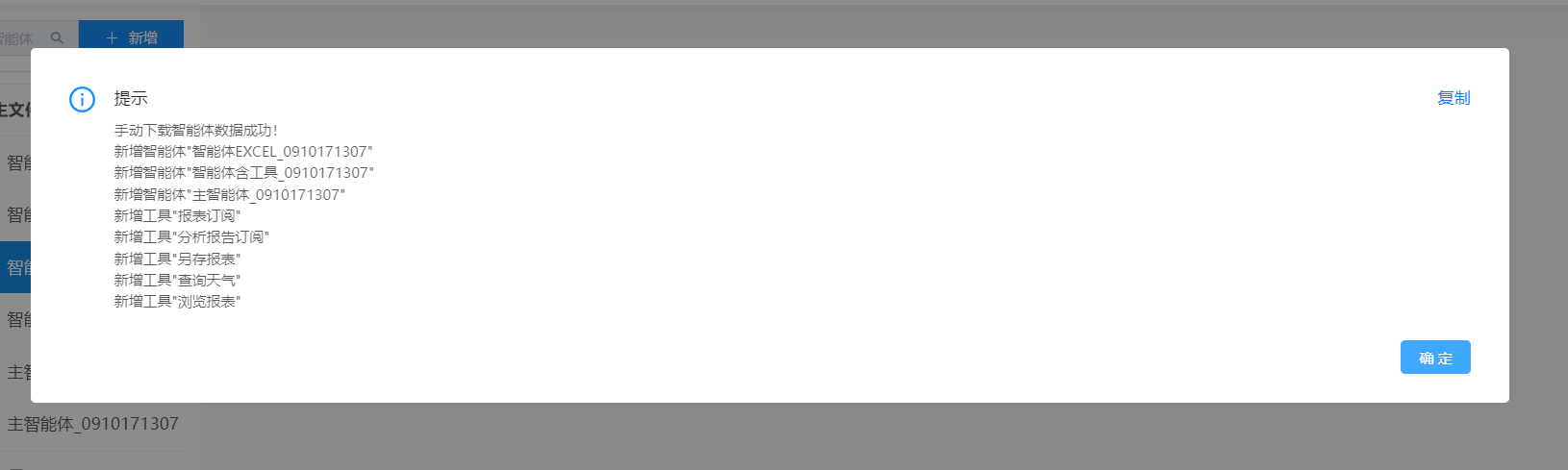 【导入智能体】:能够将其他BI环境导出的智能体导入到当前环境;