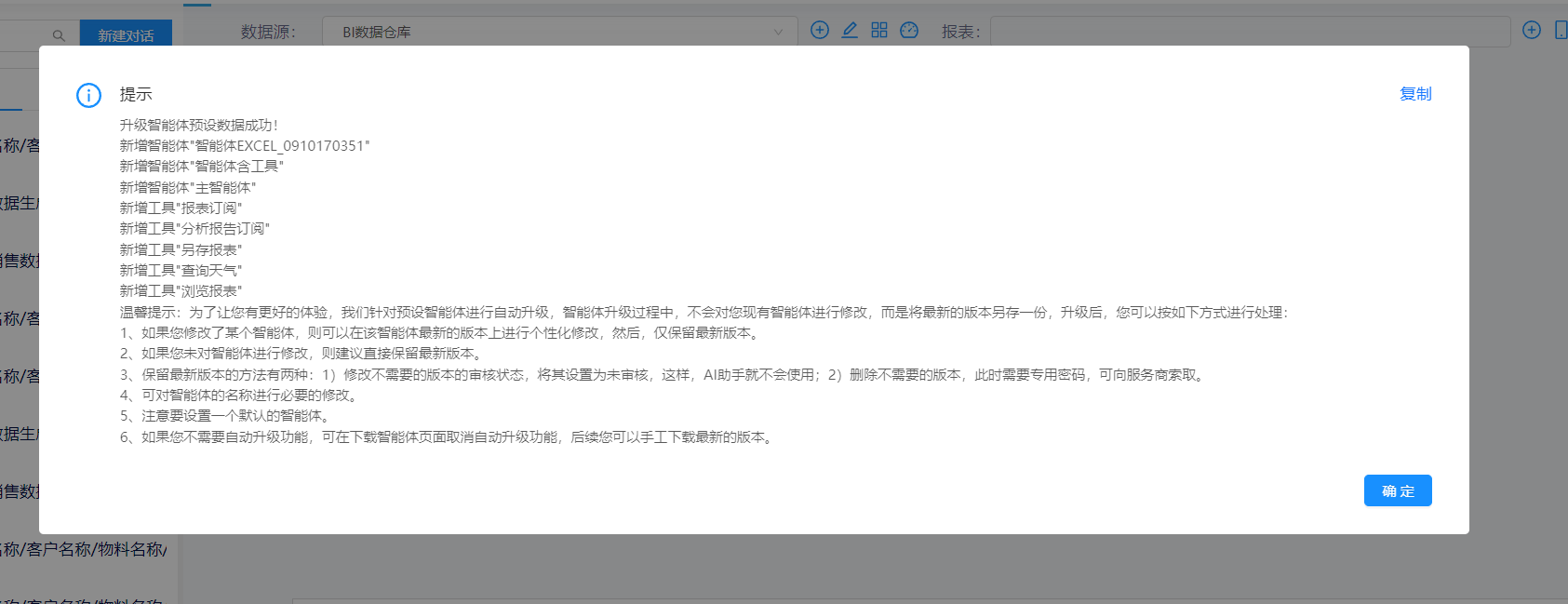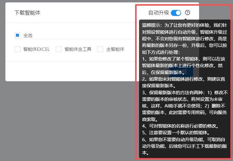 当我们进入AI助手或者智能体界面,如果智能体有更新会自动下载最新版本并另存一份。