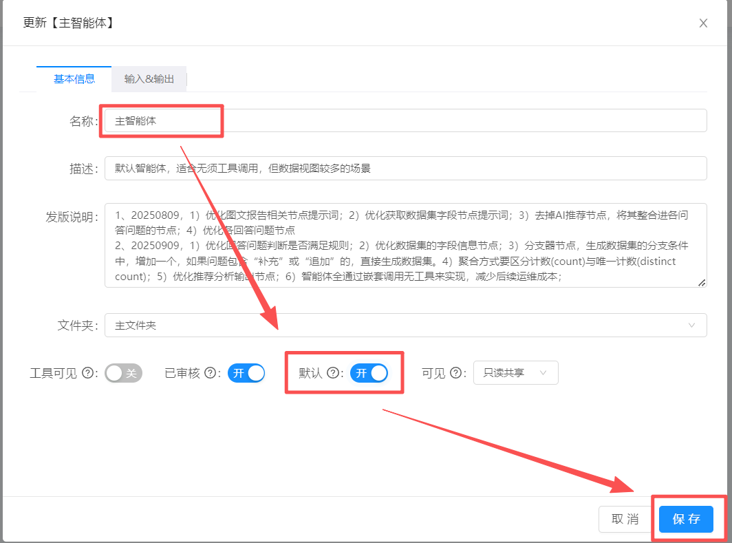 【默认】开启默认状态,则AI助手中默认使用该智能体进行问答;
