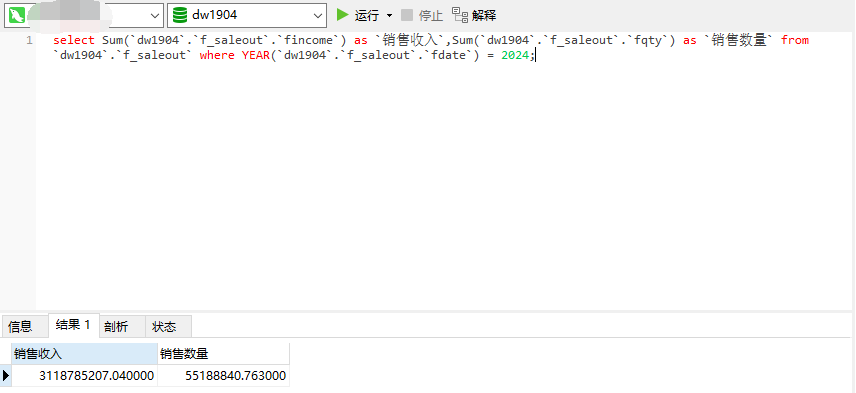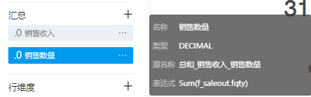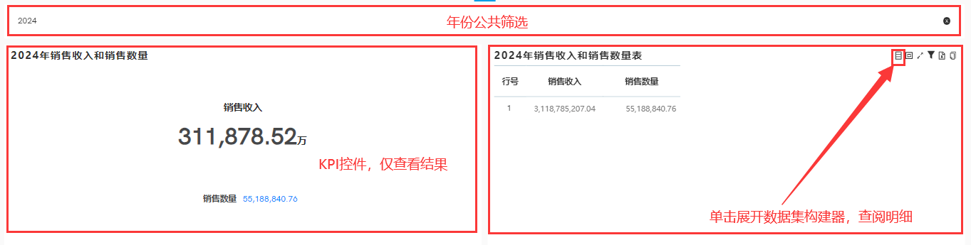 可查看到汇总指标取自销售收入表的“销售收入”和“销售数量”字段或者指标管理里面的指标,筛选区域存在时间年筛选,筛选值为“2024”,符合实际需要。