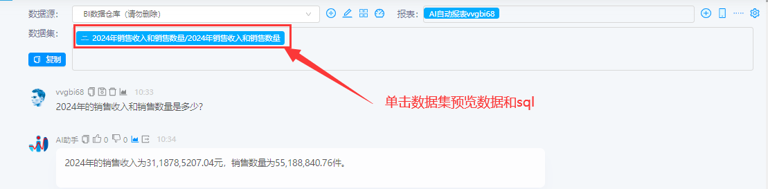 跳转至AI自动报表,可点击表格控件右上角的数据集构建器,查看数据集内部构成。