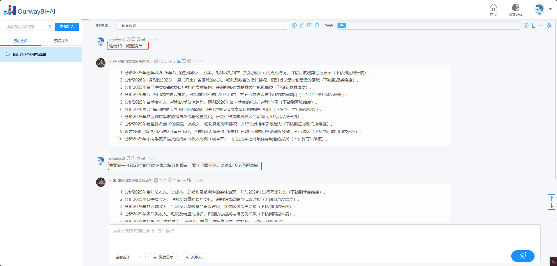 提问:‘输出10个问题清单’‘我要做一份2025年的年终销售总结分析报告,要求全面立体,请输出10个问题清单’