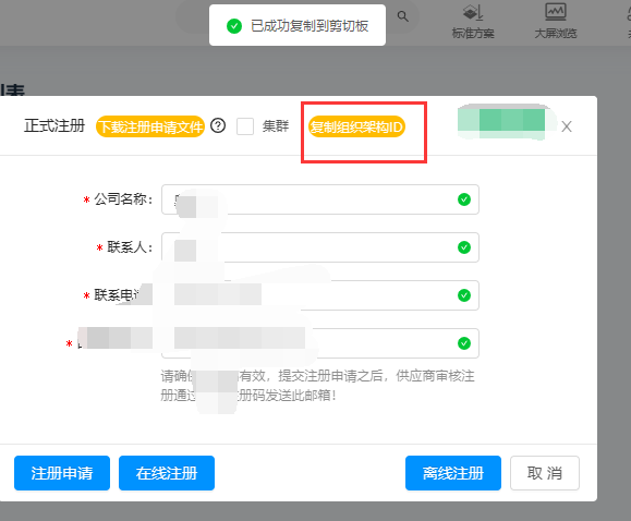 (2)联系微信群的技术同事,提供组织架构id,走完申请流程后,技术同事会提供对应的密码。
