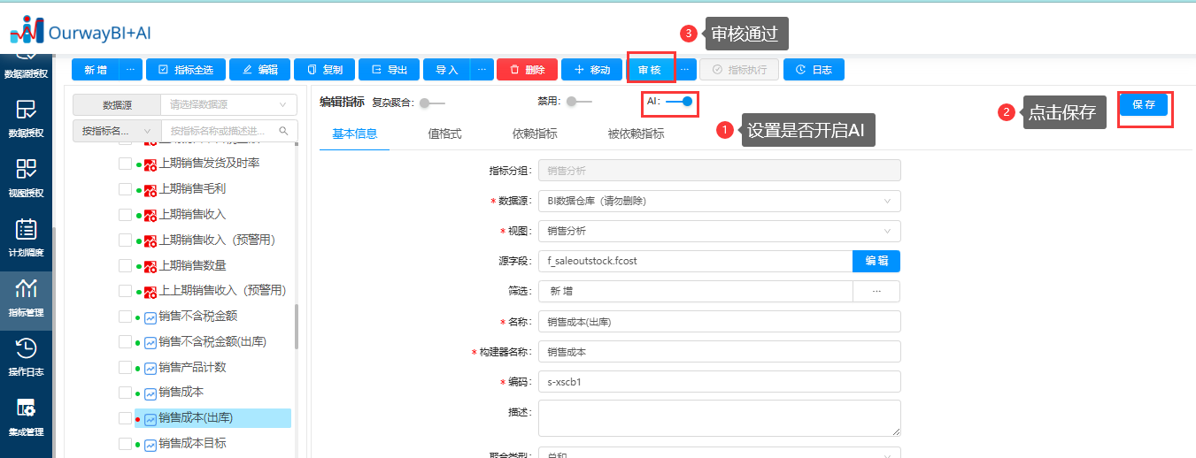 注:关闭了AI属性的指标,如果该指标是被其他指标或者指标模型所引用,则这些指标/指标模型在被AI引用来作答时,会无法正常输出结果,设置需谨慎。