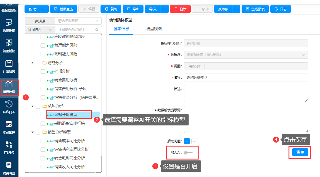 标准方案根据一些复杂的计算和分析场景,构建了指标模型以供AI使用,减少作答时的幻觉。如果实际使用AI助手过程中,需要对指标模型是否加入AI进行调整,可以参照下图进行调整。
